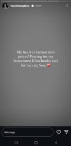 بعد تعرّض مدينة صور لغارات إسرائيليّة عنيفة اليوم، عبّرت ملكة جمال لبنان السابقة ياسمينا زيتون عن حزنها، وكتبت عبر خاصيّة “ستوري” عبر حسابها على “انستغرام”: