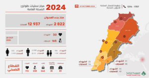 نشر مركز عمليات طوارئ الصحة العامة التابع لوزارة الصحة العامة التقرير اليومي لحصيلة وتداعيات الهجمات الإسرائيلية على لبنان وفيه، أن “غارات الجيش الإسرائيلي ليوم أمس الثلثاء 29 تشرين الاول 2024 اسفرت عن 30 قتيلاً و 165 جريحاً”.