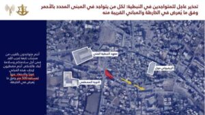 وجه المتحدث باسم الجيش الإسرائيلي أفيخاي أدرعي إنذارا عاجلا إلى جميع السكان المتواجدين في منطقة النبطية وتحديدًا في المباني المحددة في الخرائط المرفقة والمباني المجاورة لها (تجدون الخرائط مرفقة).