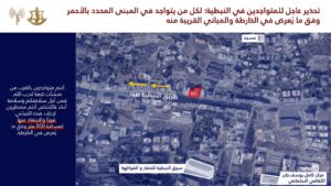 “أنتم تتواجدون بالقرب من منشآت ومصالح تابعة لحزب الله حيث سيعمل ضدها جيش الدفاع على المدى الزمني القريب من أجل سلامتكم وسلامة أبناء عائلتكم، عليكم اخلاء المباني وتلك المجاورة لها فورًا والابتعاد عنها لمسافة لا تقل عن 500 متر وفق ما يعرض في الخرائط”.