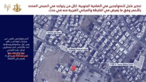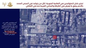 وجّه المتحدث باسم الجيش الإسرائيلي أفيخاي أدرعي تحذيراً جديداً إلى جميع السكان المتواجدين في منطقة الضاحية الجنوبية وتحديدًا في المباني المحدّدة في الخرائط المرفقة والمباني المجاورة لها في حارة حريك، الغبيري، الليلكي والحدت بضرورة الإخلاء فوراً.
