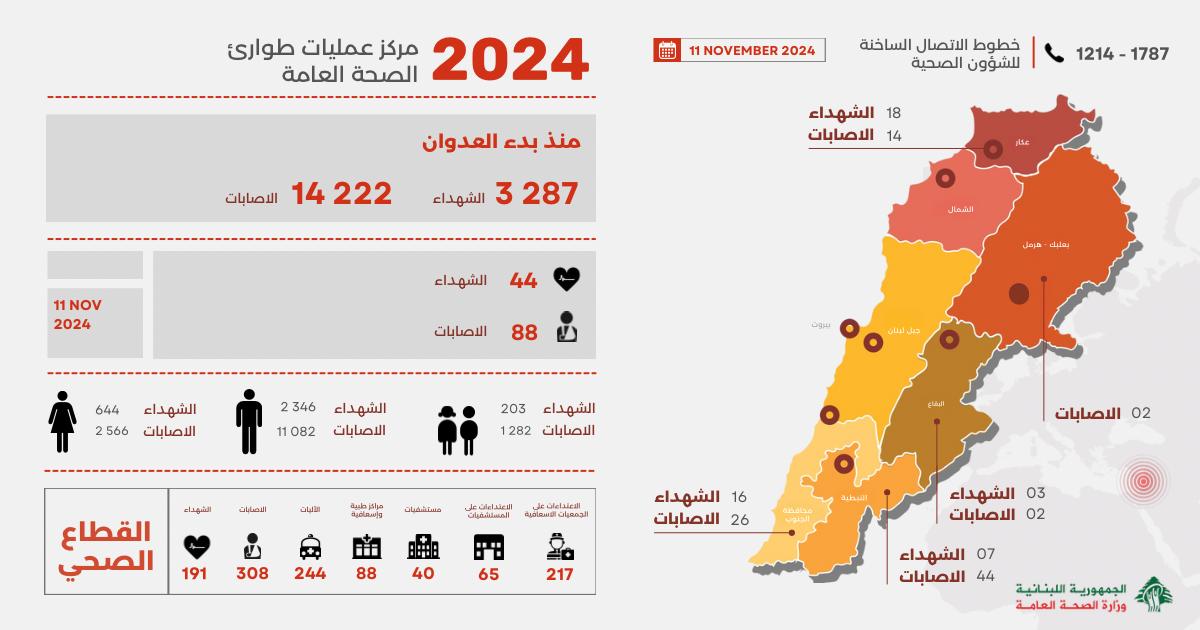 صدر عن مركز عمليات طوارئ الصحة العامة التابع لوزارة الصحة العامة التقرير اليومي لحصيلة وتداعيات العدوان الإسرائيلي على لبنان، وفيه أن غارات العدوّ الإسرائيلي ليوم أمس الاثنين 11 تشرين الثاني 2024 اسفرت عن 44 شهيدا و 88 جريحا.