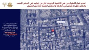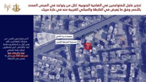 إلى جميع السكان المتواجدين في منطقة الضاحية الجنوبية وتحديدًا في المباني المحددة في الخرائط المرفقة والمباني المجاورة لها في المناطق التالية: