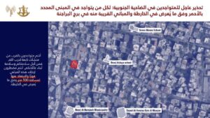 من أجل سلامتكم وسلامة أبناء عائلتكم عليكم اخلاء هذه المباني وتلك المجاورة لها فورًا والابتعاد عنها لمسافة لا تقل عن 500 متر.