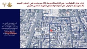 ‏⭕️من أجل سلامتكم وسلامة أبناء عائلتكم عليكم اخلاء هذه المباني وتلك المجاورة لها فورًا والابتعاد عنها لمسافة لا تقل عن 500 متر