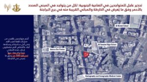 إلى جميع السكان المتواجدين في منطقة الضاحية الجنوبية وتحديدًا في المباني المحددة في الخرائط المرفقة والمباني المجاورة لها في المناطق التالية: