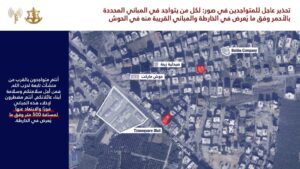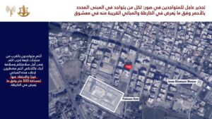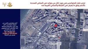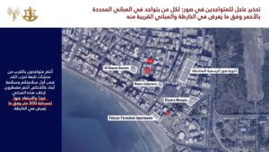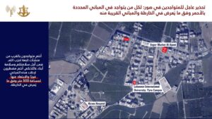 وأضاف: “إلى جميع السكان المتواجدين في منطقة صور وتحديدًا في المباني المحددة في الخرائط المرفقة والمباني المجاورة لها