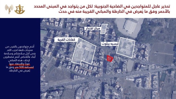 ‏أنتم تتواجدون بالقرب من منشآت ومصالح تابعة لحزب الله حيث سيعمل ضدها جيش الدفاع على المدى الزمني القريب .