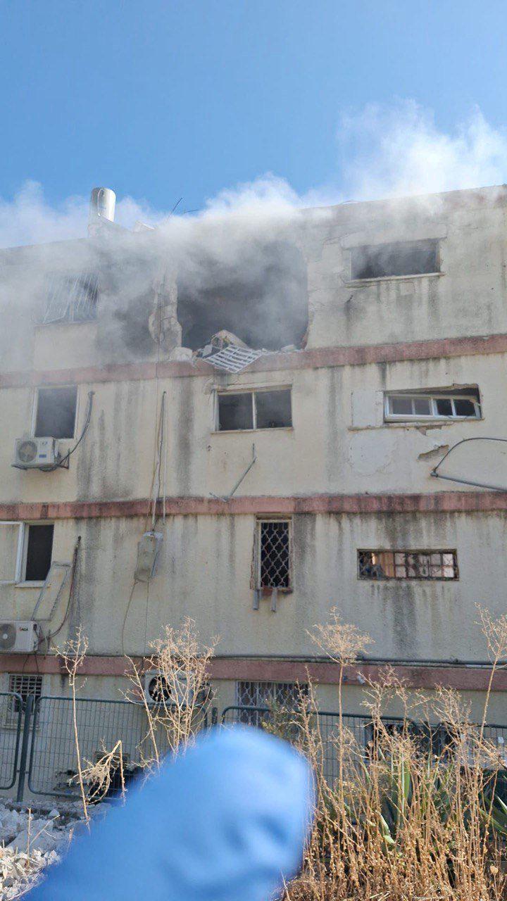 صورة للمبنى الذي تضرر بشكل مباشر في كريات شمونة بعد إطلاق رشقة صاروخية من لبنان
