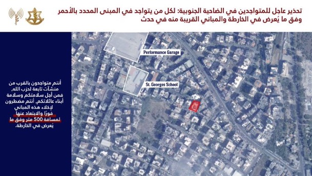 ‏أنتم تتواجدون بالقرب من منشآت ومصالح تابعة لحزب الله حيث سيعمل ضدها جيش الدفاع على المدى الزمني القريب.