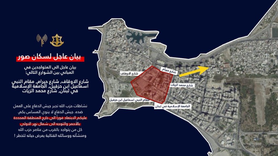 بيان عاجل لسكان منطقة صور في لبنان وتحديدًا إلى المتواجدين في المباني بين الشوارع: شارع الاوقاف, شارع حيرام, مقام النبي اسماعيل ابن حزقيل, الجامعة الإسلامية في لبنان، شارع محمد الزيات.