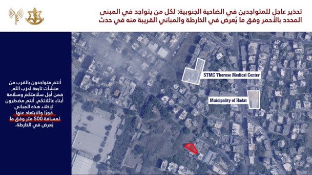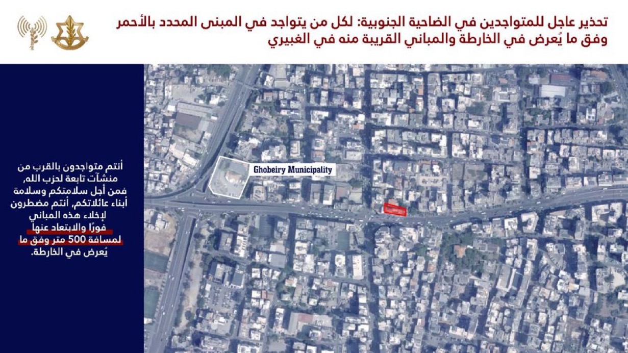 أنتم تتواجدون بالقرب من منشآت ومصالح تابعة لحزب الله حيث سيعمل ضدها جيش الدفاع على المدى الزمني القريب.