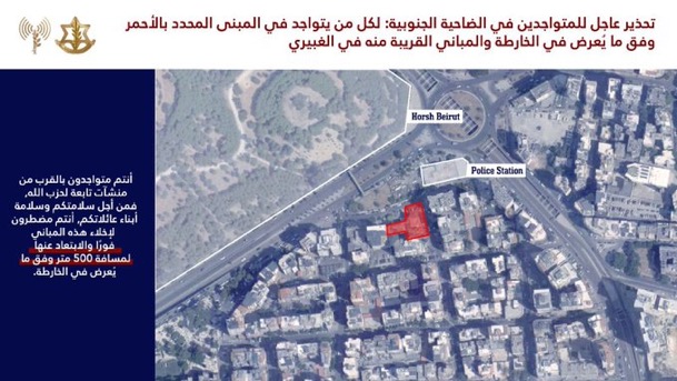 إلى جميع السكان المتواجدين في منطقة الضاحية الجنوبية وتحديدًا في المباني المحددة في الخرائط المرفقة والمباني المجاورة لها في المناطق التالية: