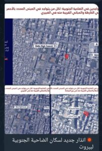 #عاجل إلى جميع السكان المتواجدين في منطقة الضاحية الجنوبية وتحديدًا في المباني المحددة في الخرائط المرفقة والمباني المجاورة لها في المناطق التالية: