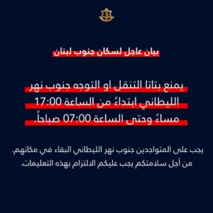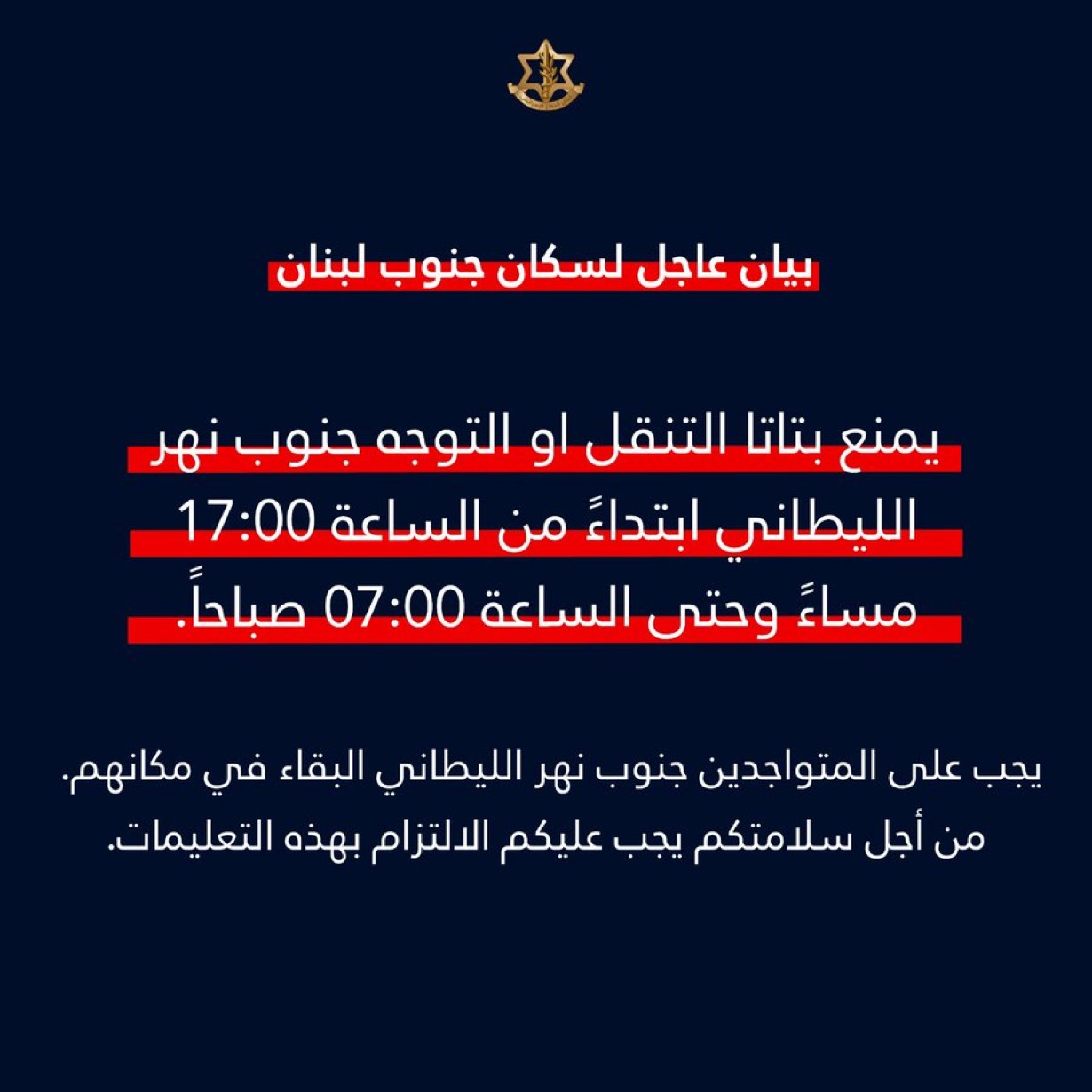 ‏يمنع بتاتًا التنقل أو الانتقال جنوب نهر الليطاني ابتداء من الساعة الخامسة مساء (17:00) وحتى الساعة السابعة صباحًا (07:00) يوم غد.