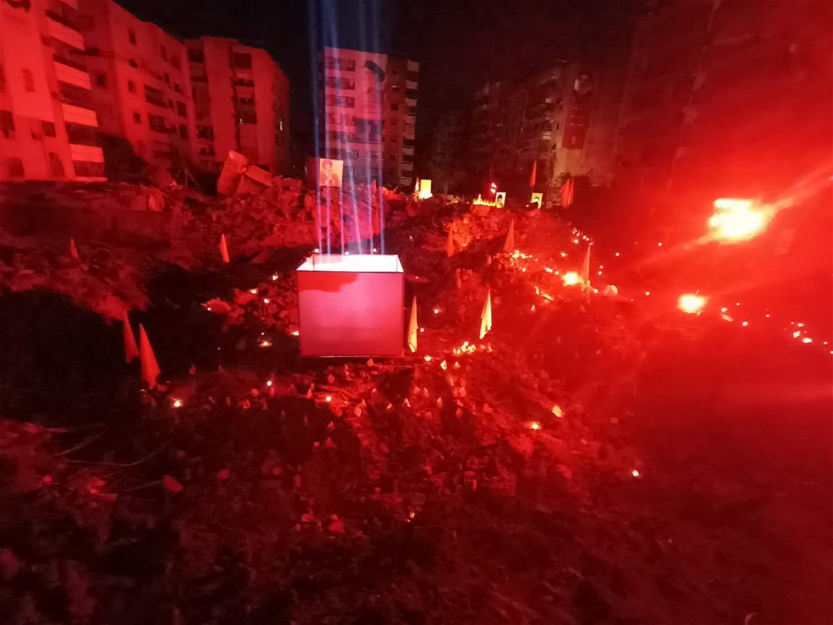 وقد أُضيئت الشموع في المكان الذي استشهد فيه نصرالله، وتمّ وضع شاشة كبيرة عليها صورته.