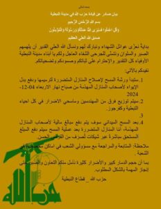أعلنت قيادة حزب الله في مدينة النبطية أن عملية مسح الأضرار تنطلق اليوم في النبطية وكفرجوز.