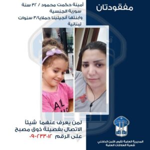 تعمِّم المديريّة العامّة لقوى الأمن الدّاخلي، بناءً على إشارة القضاء المختص، صورة والدة وطفلتها: