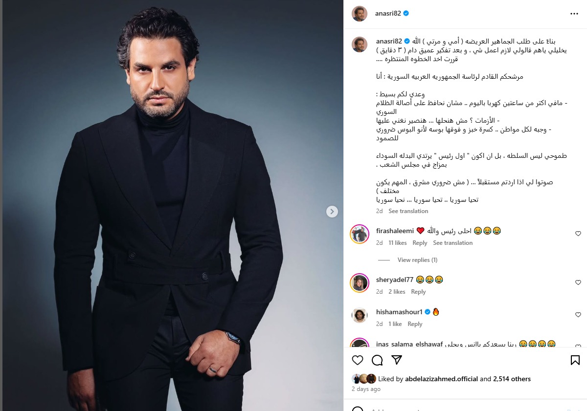 أعلن شقيق الفنانة السورية أصالة نصري الذي يدعى أنس نصري، عن ترشحه لرئاسة سوريا، وذلك استجابة لطلب والدته وزوجته.