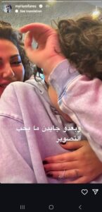 وقام نجل فارس بإخفاء وجهه عند التقاط والدته الصورة، وقد علّقت ميريام بالقول: “وبعدو جايدن ما بحب التصوير”. (رصد لبنان 24)