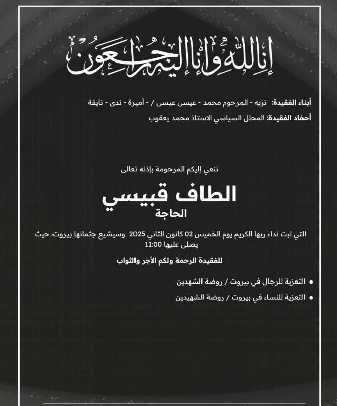 توفيّت “الطاف قبيسي” جدة المحلل السياسي محمد يعقوب وأسرة “BreakingNewsLeb” تتقدّم بأحر التعازي من عائلة المرحوم.