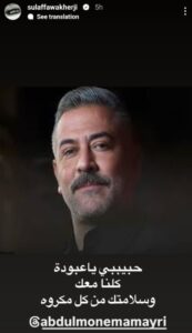 ونشرت سلاف صورة عمايري عبر خاصية “الستوري” على حسابها الخاص على تطبيق انستغرام، وعلّقت عليها قائلة: “حبيبي يا عبودة. كلنا معك. وسلامتك من كل مكروه”.