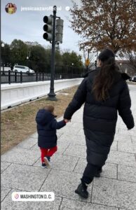 وظهرت جيسيكا في الصورة وهي تمشي في أحد شوارع واشنطن برفقة ابنها “فهد”.