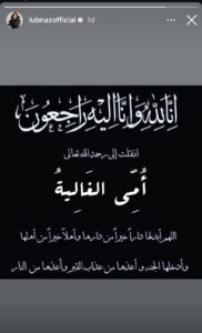 أعلنت الممثلة السعودية، لبنى عبد العزيز، عن وفاة والدتها، يوم الإثنين الموافق العاشر من شباط الجاري.