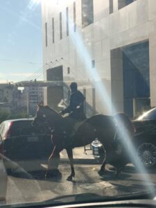 وأظهرت الصور كيف أنَّ الأحصنة سارت بجانب السيارات داخل إحدى شوارع المدينة التي شهدت زحمة خانقة تزامناً مع بدء شهر رمضان المُبارك.