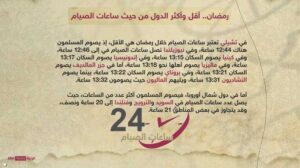 وفي دراسة ذكرها موقع سكاي نيوز ليبين الفروق الزمنية ساعات الصيام خلال الشهر في كل دولة، ولكن اعتمد بصورة أولية على ساعات الصيام في اليوم الأول من شهر رمضان، مع ملاحظة أن التوقيت المعتمد تقريب