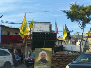 رصد مواطنون في منطقة الأوزاعي – بيروت، راجمة صواريخ موضوعة وسط الطريق وحولها أعلام “حزب الله