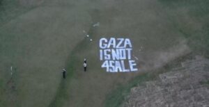 وكتبت عبارة “غزة ليست للبيع” على العشب بأحرف بيضاء بطول أكثر من مترين.