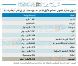 وفيما يخص الدول التي استورد منها لبنان، أظهرت البيانات أن قيمة الواردات من الدول العشر الأولى وصلت إلى 10.4 مليار دولار، أي ما يمثل نسبة 61% من إجمالي قيمة الواردات.