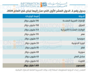 أما في مجال الصادرات، فقد تصدرت دولة الإمارات العربية المتحدة قائمة الدول التي صدر إليها لبنان، بقيمة صادرات بلغت 516 مليون دولار. ووفقًا للبيانات، فقد وصلت قيمة الصادرات إلى الدول العشر الأولى إلى 1.451 مليار دولار، أي ما يمثل نسبة 54% من إجمالي قيمة الصادرات.