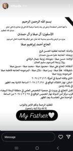 وأعلنت صفا عن الخبر الحزين عبر خاصية “ستوري” عبر حسابها على “انستغرام”، حيث اكتفت بالتعليق على ورقة النعوة التي نشرتها بالقول “والدي”.