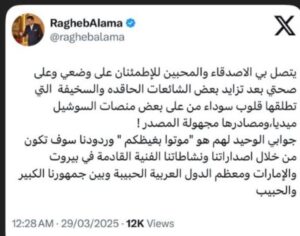 وعلّق علامة عبر “ستوري” على صفحته الشخصية في “انستغرام” قائلاً :”بتصل بي الاصدقاء والمحبين للإطمئنان على وضعي وعلى صحتي بعد تزايد بعض الشائعات الحاقدة والسخيفة التي أطلقها قلوب سوداء من على بعض منصات السوشيل ميديا، ومصادرها مجهولة المصدر! جوابي الوحيد لهم هو “موتوا بغيظكم ” وردودنا سوف تكون من خلال اصداراتنا ونشاطاتنا الفنية القادمة في بيروت والإمارات ومعظم الدول العربية الحبيبة وبين جمهورنا الكبير والحبيب”.