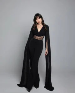 وتألقت أبي كنعان بجمبسوت أنيق باللون الأسود من علامة Thym تميز بتصميمه الفخم بياقة مفتوحة على شكل V، مع الدانتيل الشفاف عند منطقة الخصر، إضافة الى الأكمام المنسدلة بأسلوب الكاب بقماش شفاف. وتزينت بأقراط ذهبية كبيرة الحجم مزينة بحجر الياقوت الأحمر وهو ما أضاف لمسة من الأناقة والفخامة الى إطلالتها.