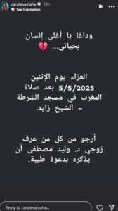 وكتبت كارول سماحة عبر خاصية “الاستوري” التابع لحسابها الرسمي على “إنستغرام” منشور جاء كالتالي: “وداعاً يا أغلي إنسان بحياتي.. العزاء يوم الاثنين 5-5-2025 – بعد صلاة المغرب في مسجد الشرطة الشيخ زايد..أرجو من كل من عرف زوجي د. وليد مصطفى أن يذكر بدعوة طيبة”.