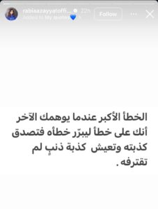 أثارت الإعلامية رابعة الزيات جدلاً واسعاً بعد نشرها صورة عبر خاصية “الستوري” على حسابها الخاص على “انستغرم”، أرفقتها بكلمات مؤثرة جاء فيها “الخطأ الأكبر عندما يوهمك الأخر أنك على خطأ ليبرر خطأه فتصدق كذبته وتعيش كذبة ذنبٍ لم تقترنه”.