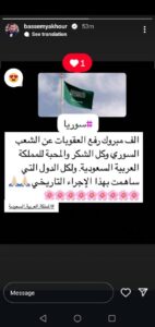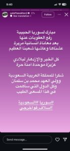 وكتبت سلاف عبر حساباتها على مواقع التواصل الإجتماعي: ” مبروك لسوريا الحبيبة رفع العقوبات عنها بعد معاناة انسانية مريرة عشناها وعاشها شعبنا العظيم.. كل الخير والإزدهار لبلادي .. عزيزة موحدة آمنة حرة.. شكرا للمملكة العربية السعودية وولي العهد محمد بن سلمان وكل الدول التي ساهمت في هذا المسعى الطيب”.