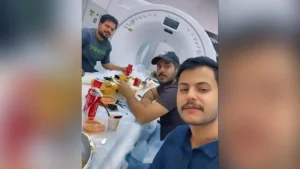 وبدأت القصة عندما تناقل عدد كبير من المدونين العراقيين صورة للموظفين الثلاثة وقد بسطوا طعامهم ومشروباتهم الغازية فوق جهاز تصوير “CT-Scan” متقدم يستخدم الاشعة السينية لإظهار أعضاء الجسم، ومشابه لعمل جهاز التصوير بالرنين المغنطيسي.
