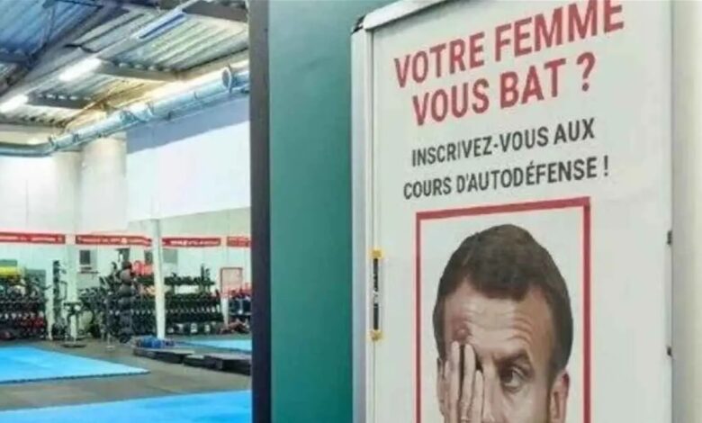 الإعلان، الذي بدا وكأنه التُقط داخل إحدى صالات الألعاب الرياضية الفرنسية، تضمن جملة مثيرة: “زوجتك تضربك؟ سجّل في دورات الدفاع عن النفس!”، مع دعوة للتواصل مع الإدارة لمزيد من التفاصيل.