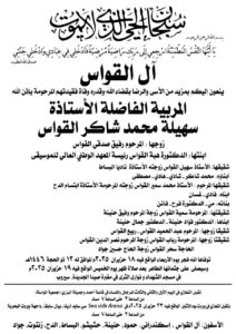 غيّب الموت سهيلة محمد شاكر القواس، والدة رئيسة المعهد الوطني العالي للموسيقى، الدكتورة هبة القواس.