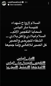 ونشرت سلاف عبر حسابها الرسمي على فيسبوك رسالة نعي قالت فيها: “السلام لأرواح شهداء كنيسة مار إلياس، ضحايا التفجير الآثم.. السلام لبلادي وأهل بلادي.. الشفاء للجرحى، والصبر كل الصبر للأهالي ولنا جميعًا”.