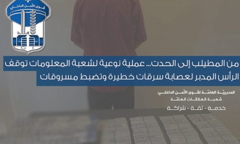 بتاريخ 26-7-2025، وبعد رصدٍ ومراقبة دقيقة، تمكّنت إحدى دوريّات الشّعبة من توقيفه بعملية نوعيّة في بلدة الحدت – بعبدا، وبتفتيش منزله ضُبِطَ قسمٌ من المبالغ الماليّة المسروقة، لوحات تسجيل سيّارات بأرقام مختلفة كانت تُستخدم بعمليّات السّرقة.