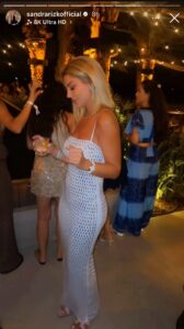السهرة التي أقيمت في أحد المنتجعات الفاخرة، غلبت عليها الأجواء الحيوية والموسيقى الراقصة، فيما بدت ساندرا مستمتعة بالأجواء برفقة عدد من الحاضرين.
