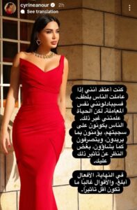 وقامت سيرين مؤخرا بنشر صورة لها عبر خاصية “الستوري” على حسابها على انستغرام وعلقت عليها بالقول: “كنت أعتقد انني إذا عاملت الناس بلطف فسيبادلونني نفس المعاملة. لكن الحياة علمتني غير ذلك. الناس يكونون على سجيتهم. يؤمنون بما يرديون ويتصرفون كما يشاؤون. بغض النظر عن تأثير ذلك عليك.”