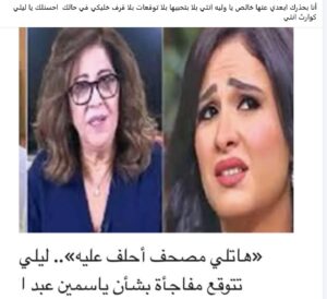 ونشر وائل عبر حسابه على “فيسبوك” صورة لياسمين بجانب صورة لعبد اللطيف، وعلّق عليها قائلاً: “أنا بحذرك، ابعدي عنها خالص يا ولية، بلا بتحبيها بلا توقعات بلا قرف، خليكي في حالك أحسنلك، يا ليلى كوارث أنتي”.