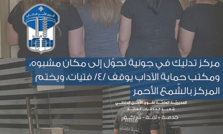 في إطار الجهود المستمرة التي تبذلها قوى الأمن الداخلي لمكافحة مختلف أنواع الجرائم، توافرت لمكتب حماية الآداب ومكافحة الإتجار بالأشخاص في وحدة الشرطة القضائية معلومات حول حصول أعمال دعارة داخل أحد مراكز التدليك في محلة جونية، حيث تم استغلال عدد من الفتيات لهذا الغرض