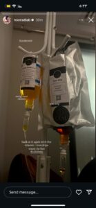 ونشرت نور صورة لها من داخل المستشفى عبر حسابها على “إنستغرام” وعلقت عليها بالقول : “العودة مرة أخرى مع قطرات الفيتامين والحديد.. الأفضل على الإطلاق.”